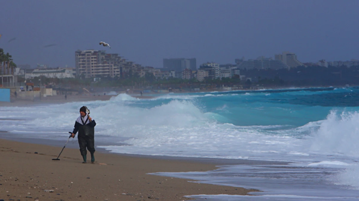 Antalya’da saatteki hızı 50 kilometreyi bulan rüzgar hayatı olumsuz etkilerken define avcıları sahile inerek değerli eşya ve madeni para aradı.