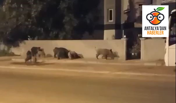 Konyaaltı ilçesi Hurma Mahallesi’nde ormanlık ve dağlık alanda aç kalan domuzlar, şehir merkezine kadar indi. Karınlarını doyurmak için apartman ve site çevrelerinde gezinen domuz sürüsü, vatandaşlara zor anlar yaşattı. O sıra dışarıda olan bazı vatandaşlar evlerine girmek isteyince site kapısında sürüyle karşılaşınca neye uğradığını şaşırdı. Süreden bir domuz site içerisine girerken, o anları kaydeden site sakini, "Ben nasıl eve gireceğim" diyerek serzenişte bulundu.