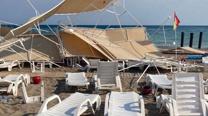 Antalya'nın Aksu ilçesi Kemerağzı bölgesinde bulunan sahilde çıkan hortumda gölgeliklerin çarptığı 6 turist hafif şekilde yaralandı.