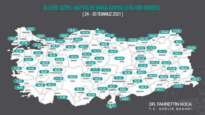 Sağlık Bakanı Fahrettin Koca, illerin her 100 bin nüfusa karşılık gelen haftalık vaka sayılarını gösteren son haritayı açıkladı. Haritaya göre, turizm hareketliliği yaşayan ve yangınlarla mücadele eden Antalya’da 100 bin kişide PCR testi pozitif çıkan kişi sayısı düştü. 17-23 Temmuz tarihleri arasında 75,97 olan vaka sayısı 24-30 Temmuz arasında 72,68’e geriledi.
