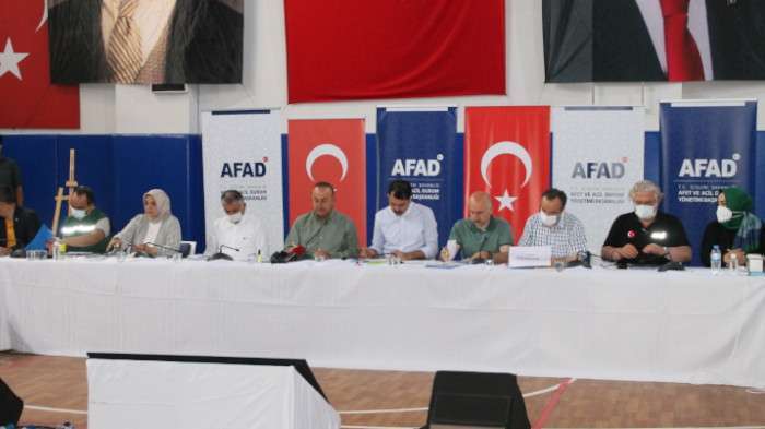 Çevre ve Şehircilik Bakanı Murat Kurum ise açıklamasında, “Ekiplerimiz vatandaşlarımızın yarasını en hızlı sarmak adına tüm çalışıyorlar. Yangında çok önemli bir mücadele verdiler. Bugün masanın bir ucundan tutma zamanıdır.Antalya’da orman yangınından 50 mahalle etkilendi. Vatandaşlarımızı güvenli alanlara çektik. Türkiye’nin her yerinden gelen destek veren vatandaşlarımız var. Yangında 722 vatandaşımız 708 tedavisi tamamlandı. 7 vatandaşımızın tedavisi devam ediyor. 45 mahallede 2 bin 400 afetzede vatandaşımıza psikodestek verdik. Hayvanlarımıza veteriner hizmeti verilmektedir. 59 vatandaşımız yurtlarda misafir ediliyor. 93 aileye konteyner sağladık. 20 mahallemizde duş ve tuvalet sistemi kurduk. 133 çadır kuruldu. Günde ortalama 14 bin vatandaşımıza yemek dağıtılıyor. Bölgemize gelen nakdi yardım 47.5 milyon TL. 912 kişiye 13 milyon TL nakdi ödemeye yapıldı. Bölgede hayati normale döndürmek için canla başla çalışıyoruz. 6 bin bağımsız bölümün incelemesi yapıldı. Yeni yapılacak konutların adımı atılıyor. En kısa zamanda o konutları yetiştirmek istiyoruz. Su verilmeyen mahallemiz kalmadı” dedi.