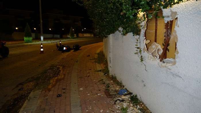 Antalya'nın Manavgat ilçesinde motosiklet sürücüsünün direksiyon hakimiyetini kaybederek sitenin bahçe duvarına çarpması sonucu meydana gelen kazada 2 kişi ağır yaralandı. Güvenlik kameralarına yansıyan kazada, aşırı hızlı olduğu görülen motosikletin kavşakta bir aracı solladıktan sonra hızla bahçe duvarına çarptığı ve asfalta savrulduğu görüldü.