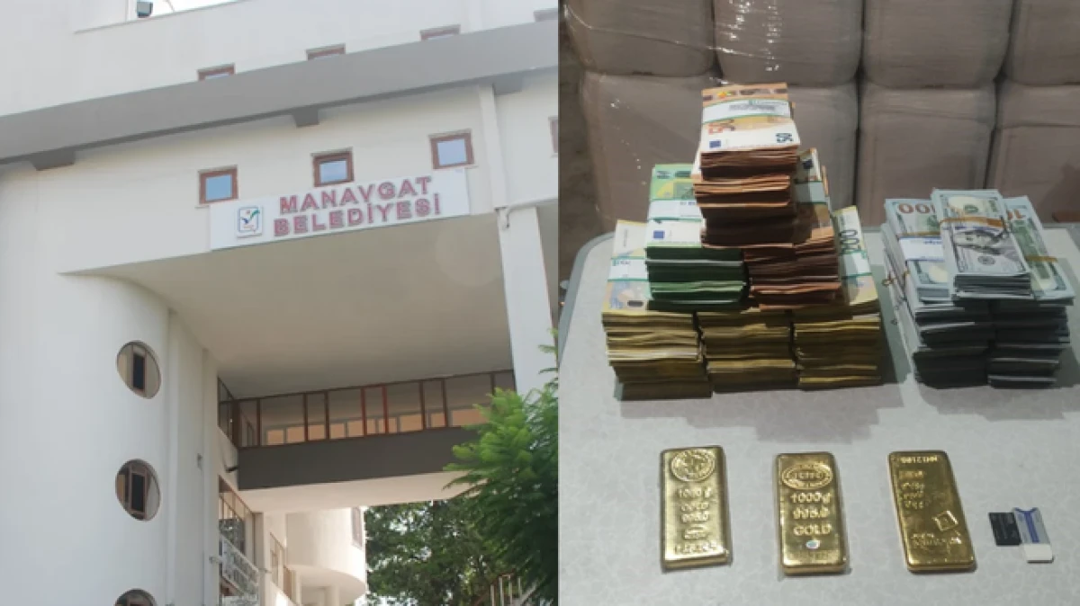 Antalya'da Manavgat Belediyesi'ne yönelik yürütülen 'yolsuzluk' ve 'rüşvet' soruşturmasında zirai bir depoda gizlenmiş halde 3 kilogram külçe altın ile yarım milyon Euro ve 153 bin 160 Dolar ele geçirildi