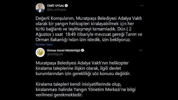 Orman Genel Müdürlüğünün sosyal medya hesabından ise Ümit Uysal’ın söz konusu tweeti etiketlenerek, “ Muratpaşa Belediyesi Adalya Vakfı’nın helikopter kiralama taleplerine ilişkin olarak, ilgili devlet kurumlarından izin gerekliliği söz konusu değildir. Kiralama talepleri kendi inisiyatiflerinde olup, kiralanması halinde Yangın Yönetim Merkezi’ne bilgi verilmesi gerekmektedir” ifadelerine yer verildi.